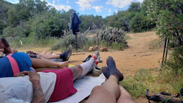 It was buggy though, and I got bored and decided to hike through the heat of the day. I began the 5 mile climb at 11:30. Occasional cloud cover and a little breeze helped make the heat manageable. The last 5 miles or so were a fairly gentle descent to the large campsite and spring at mile 101.1. When I arrived, well ahead of my group, I was a bit surprised to find 25 or so hikers and some trail angels setting up trail magic for dinner and giving out beer and snacks. Eventually there were around 40 hikers, all well fed by these lovely locals. When we ran out of beer around 7 pm, they went and got at least four more cases. I met tons of new people at this spontaneous party with strangers in the wild. It was a fantastic night.