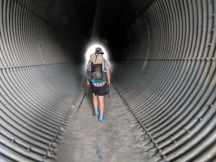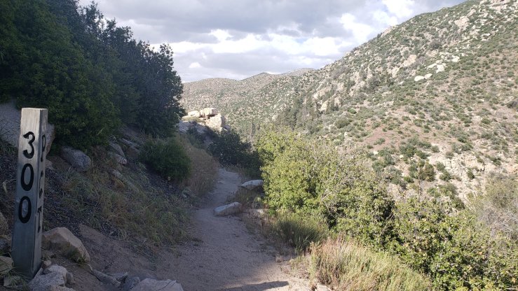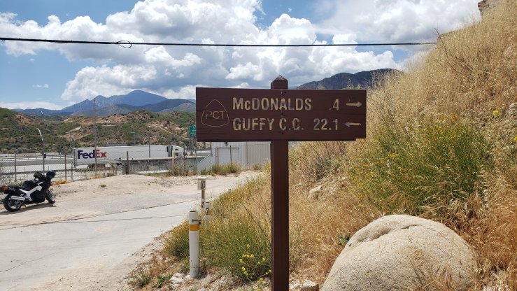 Day 31 marked a month on trail, and we had to make 20.7 miles to Guffy Campground, the next water source. The problem with the day’s hike was the climb: 6650′ of climbing over those 20.7 miles. Thankfully the weather was decent, 70s and partly cloudy. The climb was rarely steep, instead maintaining a steady but persistent incline. After about 8 miles, I began to notice my vision getting funny in my right eye, a sign of a migraine — something from which I suffer occasionally. I pushed another 4 miles through the discomfort until I found a nice shaded place to set up my tent and nap for a couple hours. I woke up shortly after 3 and felt good enough to continue hiking, so I packed up and headed out. The trail had been climbing from a high desert valley all morning, but as I rounded a corner after resuming my hike, the landscape changed dramatically. Mount San Antonio rose above a valley of pine trees, all signs of the desert suddenly gone. I finished the hike and fetched water from Guffy Spring down the incredibly steep side trail. Camped at mile 364.3, we left just 5 miles to Highway 2, where we could hitch into Wrightwood.