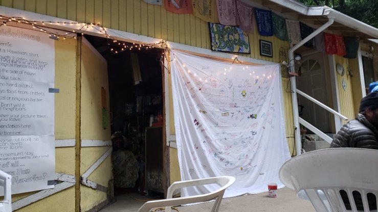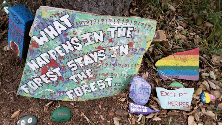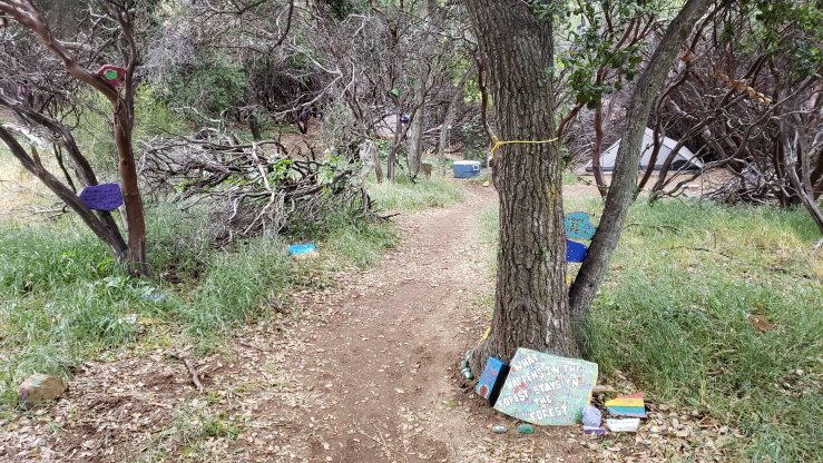 We got a little rain overnight, so I didn’t get going until after 8, waiting for the sun to dry my tent. The morning’s weather was much nicer, still rather cool compared to average, but sunny at least. The miles to Casa de Luna passed fairly quickly and easily, heading over small mountains from one verdant valley to the next. As we reached the road, storms were coming in to the east, and it began to rain. After struggling to get a hitch for some time, we decided to just walk the 2 miles to Casa de Luna. Less than a mile in though, a nice guy stopped and gave us a ride the rest of the way. Casa de Luna is another trail angel’s home that has been opened for hikers. Terrie provides breakfast and dinner, water, a fun place to hang out, camping, and the annual PCT class bandana. Her backyard extends seemingly forever — a dense Manzanita forest in which dozens of campsites have been carved out, with diverging trails making a maze out of the area. All around the forest are rocks that hikers have painted using the supplies Terrie provides. These rocks often have inspirational or funny messages painted on them, though some are just pretty and a few are genuine works of art. We enjoyed an afternoon of drinking beer and relaxing at Casa de Luna. In the evening, we enjoyed the nachos (“taco salad”) for dinner, after which every hiker had to come up and do a little dance to earn their bandana.
