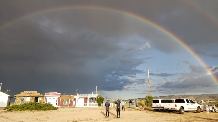 On day 44, we got going a little slowly as we only had 9.4 miles to Hiker Town at mile 517.6. The descent to the desert was easy enough, and as we arrived shortly after 12, the morning’s sun was turning to clouds, with ominous dark storms in the far distance. Hiker Town is a neat, very kitschy hostel, where hikers can rent cabins for cheap or camp for free, take a shower, charge electronics and just relax. We hopped on the shuttle to the market down the road after getting our rooms picked out (Joren, Benjamin, Jackson and I took City Hall, and as such were the temporary mayors of Hiker Town). The market had excellent food, and after eating way too much, we headed back to Hiker Town, and had an enjoyable night watching the storm split around us, then pass by, leaving an incredible rainbow. The sunset was fantastic as well.
