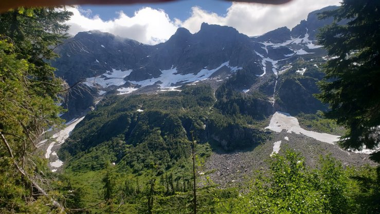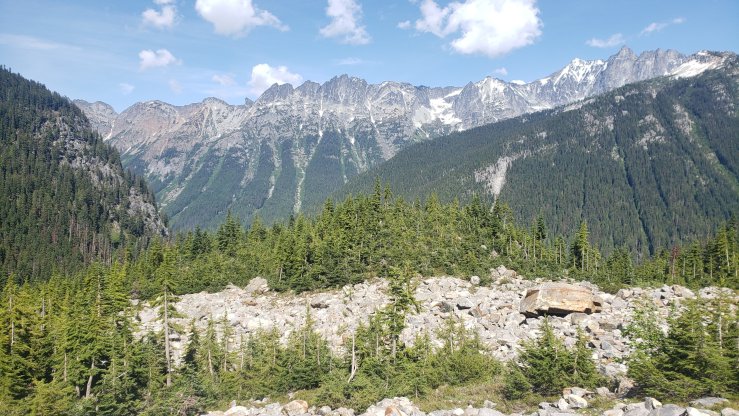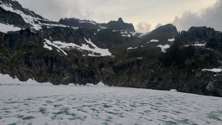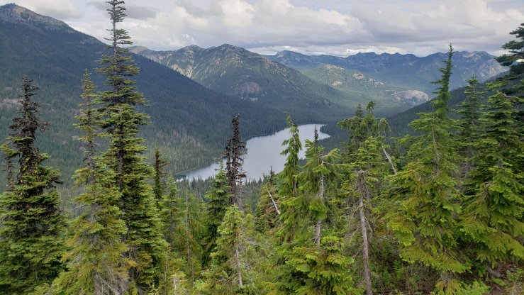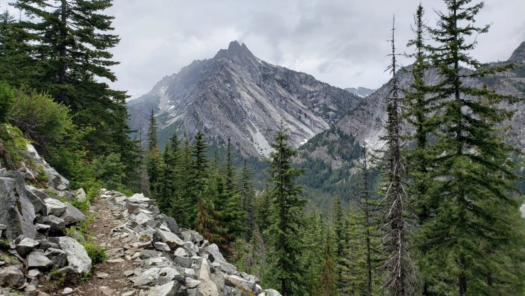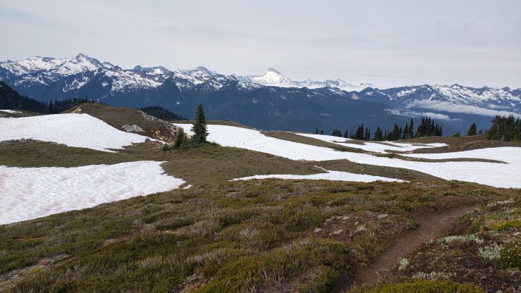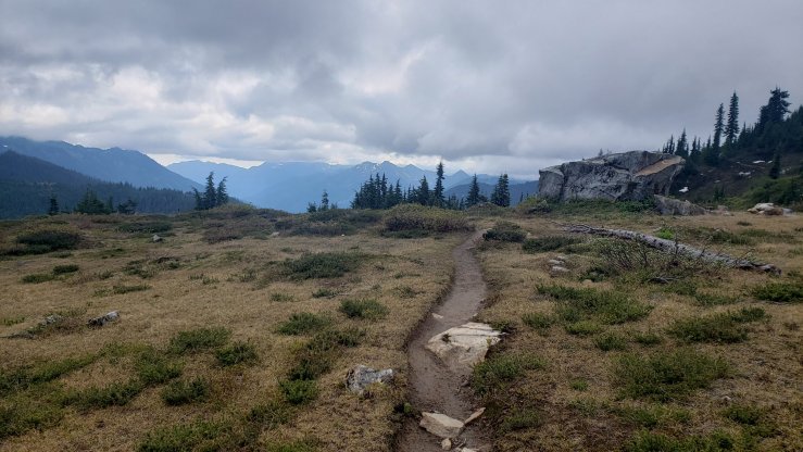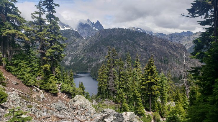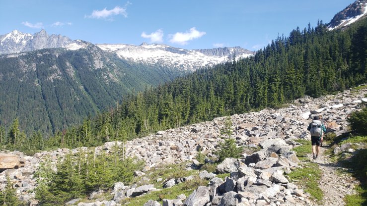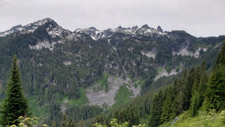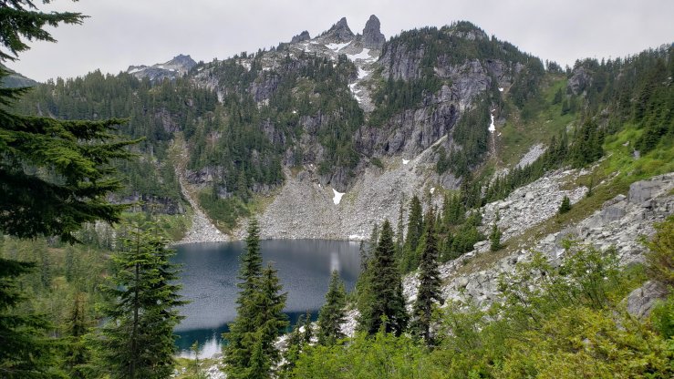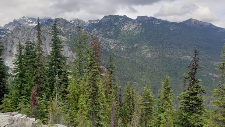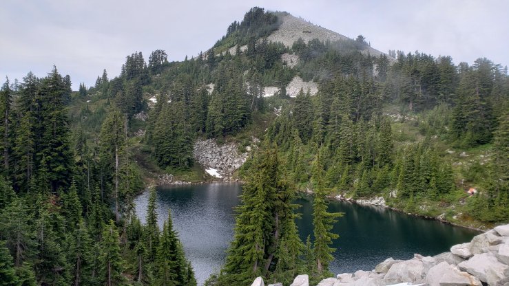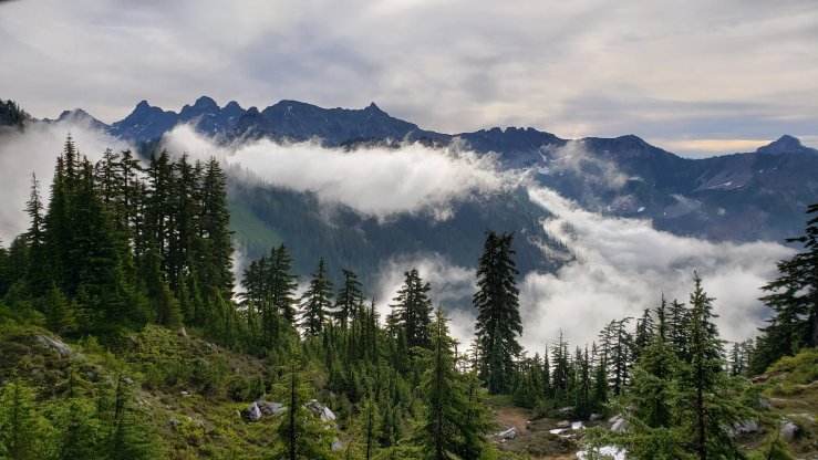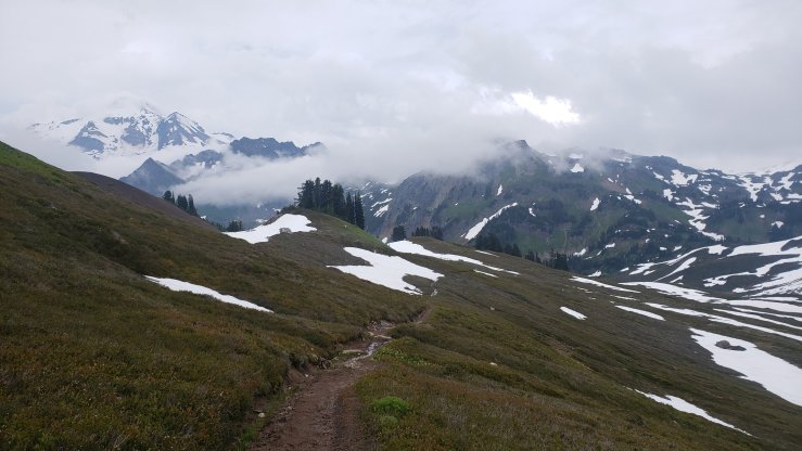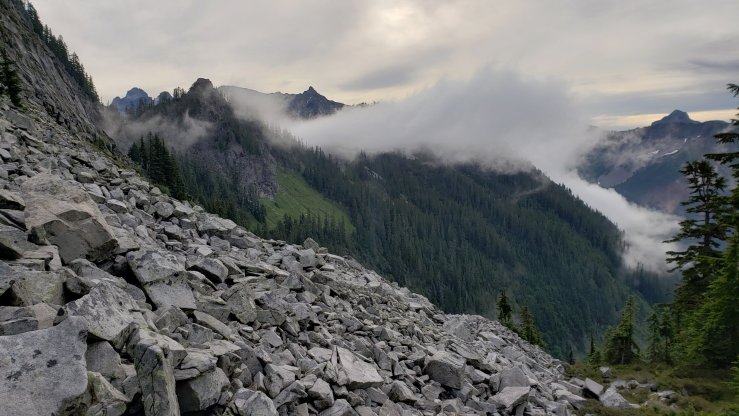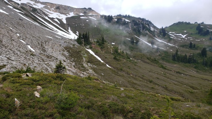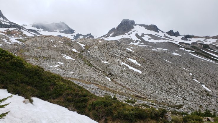 The morning of day 91 started out misty and buggy. Trying to do one’s morning business while being swarmed by mosquitoes is not very pleasant, I can unfortunately report. I quickly packed up and made my way out of the hellish mosquito territory, over a ridge and into the lovely protected area. Alpine streams snaked through delicate grasses, ponds dotting the foggy but clearing landscape as the sun did its best to shine through. The trail then descended a seemingly endless switchback, with mountains across the valley providing excellent scenery along the way. The clouds wrapped around the peaks as they blew by, and a gentle breeze helped ward off mosquitoes. Once in the valley, a sign at a junction suggested an alternate for stockmen, as a bridge ahead was out. Sure enough, at Lemah Creek, there was no bridge, and a ford was required, at one point nearly thigh deep and fairly swift. Having crossed without incident, I was yet again resigned to hiking with wet feet. The climb out of the valley went through an old burn area, the dried out husks of old dead giants looming above. Frequent trees across the trail made this section frustrating at times, though the view was tremendous, particularly of Spectacle Lake and its surrounding mountains. After passing a few alpine ponds, the trail began a climb on pure shale. As it turned out, almost the entire next 5 or so miles were on shale, on the sides of steep slopes. This was quite painful on my wet and already sore feet, and by the end I nearly had tears in my eyes. My shoes are not very well cushioned, which typically is something I like for long distance hiking as it forces one to be more cognizant of one’s steps. However, this pair is at its life’s end, with over 500 miles on them, and after miles of unstable, sharp rock, I was wishing for something with a bit more cushion. We camped at Ridge Lake, a cute alpine lake with excellent views. Unfortunately, intermittent drizzle and pesky mosquitoes kept us in our tents most of the evening yet again.