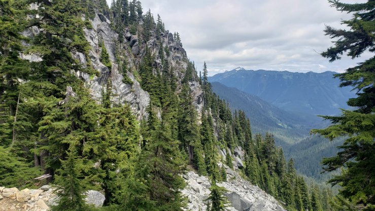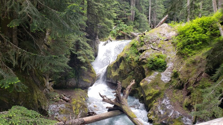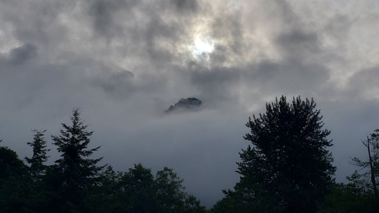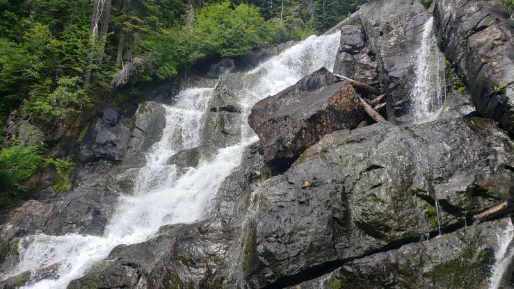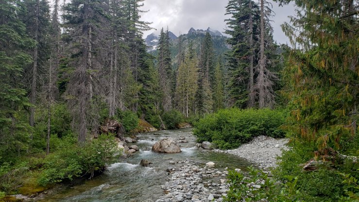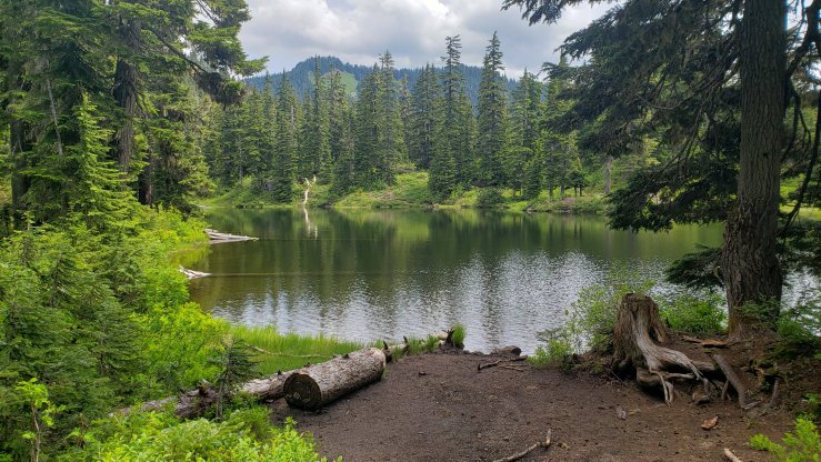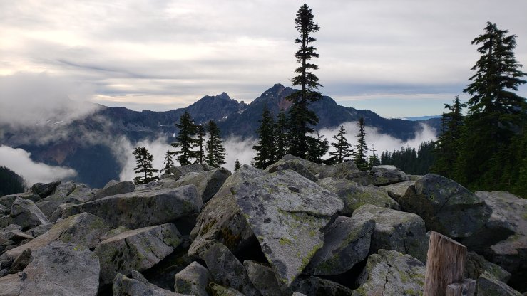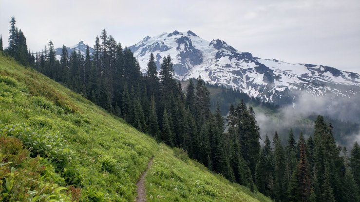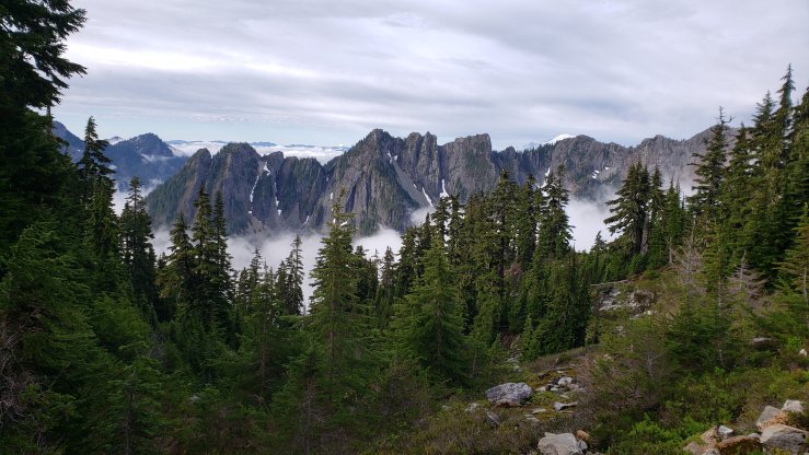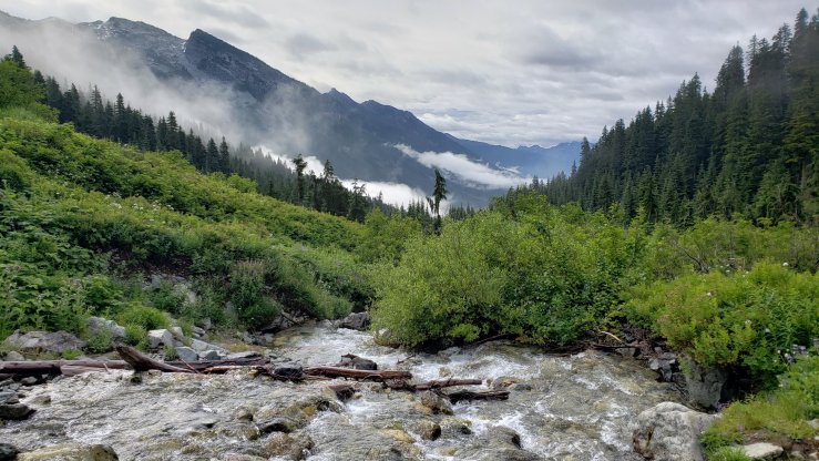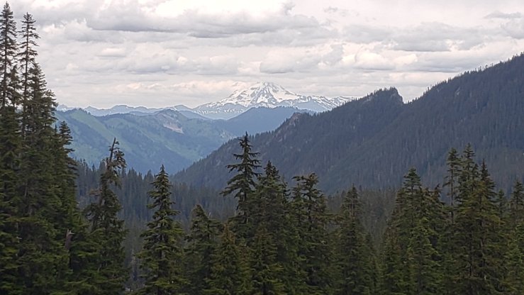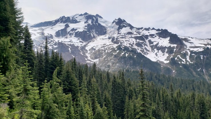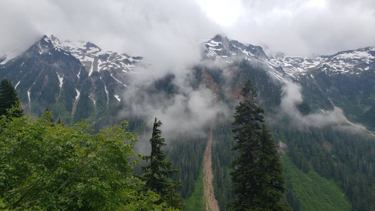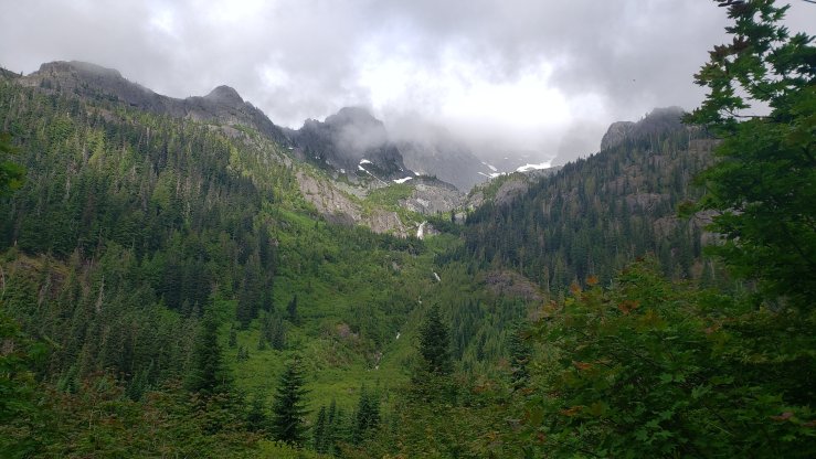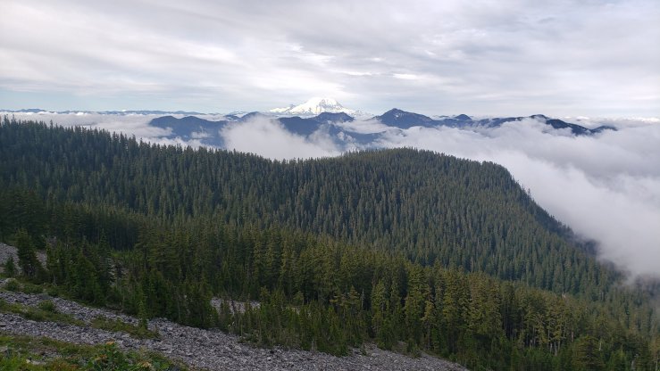Day 90 was to be a 22.2 mile day, to a campsite shortly before a protected fragile area, in which camping is prohibited. The day was typical for this area of Washington: a mix of forest and ridge walks, clouds and fog at times, and constant elevation change. There were several fantastic views throughout the day, and a couple tough water crossings that had me walking with wet feet. Having wet feet is fairly normal in Washington however — if not from frequent stream crossings, then from mud, or the trail flowing like a creek, or most commonly, from what Sunny has dubbed the “car wash”. The trail is regularly covered in overgrowth, and when there is condensation or rain on the brush, it gets a hiker soaked; thus the “car wash”. The day was filled with mosquitoes yet again, although I found respite in a few breezy places. Unfortunately, our campsite at mile 230.1 was laden with the little bastards, so we hid in our tents all evening, barely daring to crack the bugnet enough to reach a hand out and stir a pot for dinner. It started pouring at one point in the evening, which was fine, as it had been forecast to rain all day and had held off until that point.