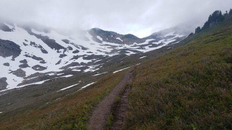 I slept in a bit on day 85, having felt that I earned it. The girls rolled past Mica Lake as I was packing up — they had camped 4 miles earlier near Milk Creek. They were planning on a campsite at mile 150.6, only 18.7 miles from where I was. Still, a shorter day sounded good after the previous day, and the only potentially sketchy snow that we had left was coming up. A heavy fog that covered the pass above broke just after 7:30, and I set off. Fire Creek Pass was the first alpine pass in awhile, and it was beautiful. There was a bit of snow — a moderate snowfield before half-covered switchbacks, then a couple moderately steep traverses. The trail, once over the pass, then made its way back into woods for a time. As I headed back up, this time to Red Pass, the scenery opened up again to a stunning granite landscape, with small grass and shrubs providing some green against the imposing rock. Streams snaked all over, and a intermittent fog rolled over the nearby peaks. The mood here was nearly tangible, a gloomy yet surreal beauty about the land. On the south side of Red Pass, two steep snow traverses awaited, which I crossed without issue. Shortly thereafter, a heavy fog obscured the nice view. However, two marmots came out, and began tussling on the trail. This was incredibly adorable, particularly when one conceded defeat and was chased all of 20 feet down the trail. Finally we reached a crowded but spacious camping area, where hordes of weekend hikers were out, presumably having a long holiday weekend. It rained in the evening and on and off all night.