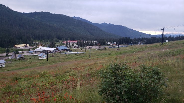 After a hiker’s share of beer and food, we ended up camping at the trailhead rather than hiking any miles. So early on day 93, we left Snoqualmie Pass, hiking up through the ski slopes that were covered in wildflowers. The trail continued on under a series of powerlines before heading through mostly forest, passing the occasional small lake. We camped on an unused dirt road at mile 281.8, a 22.3 mile day. The weather was pleasant and mosquito-free, so Inge, Sunny and I had a nice campfire and drank some Fireball whiskey before calling it a night.