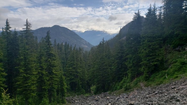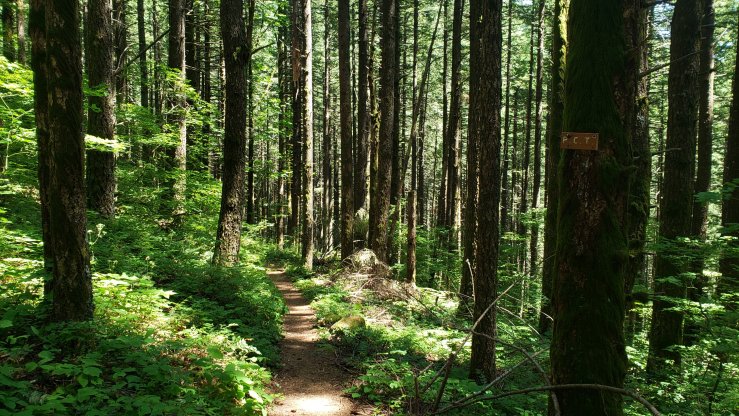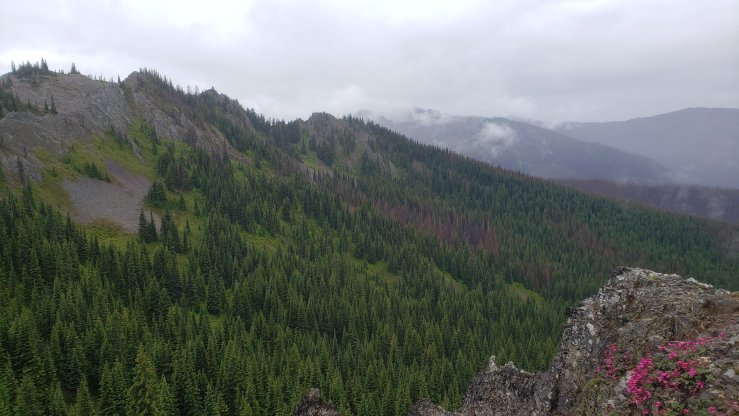 The morning of day 103 was worryingly buggy as I packed up camp, but after a short cruise the forest opened up and the mosquitoes essentially vanished. I caught up to Inge fairly quickly, and we had a nice break at the top of the morning’s climb, enjoying another great view of Mt. Adams. We spent the next few miles stopping often to eat wild huckleberries off their bushes, many perfectly ripe. They were delicious, and it was hard to stay focused on hiking. The trail descended steadily for nearly ten miles down to Panther Creek, where we stopped for lunch. The long descent put us at only about 900 feet above sea level, and accordingly it was quite warm, easily in the 90s under the sun. I stripped to my underwear and laid down in the shallow snowmelt creek, which was icy cold but incredibly refreshing. After having lunch and drying off in the sun, I finished the hike through the forest, camping at another unused dirt road at mile 480.2, a 25.5 mile day.