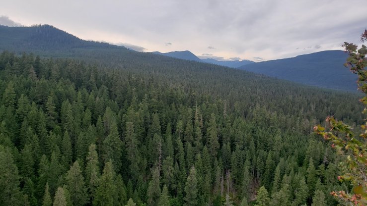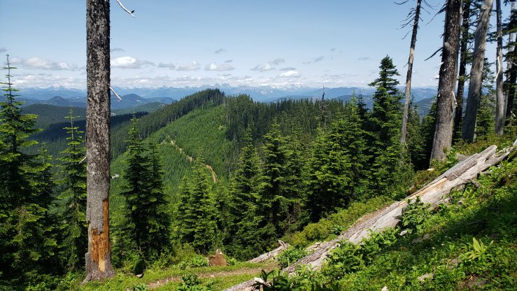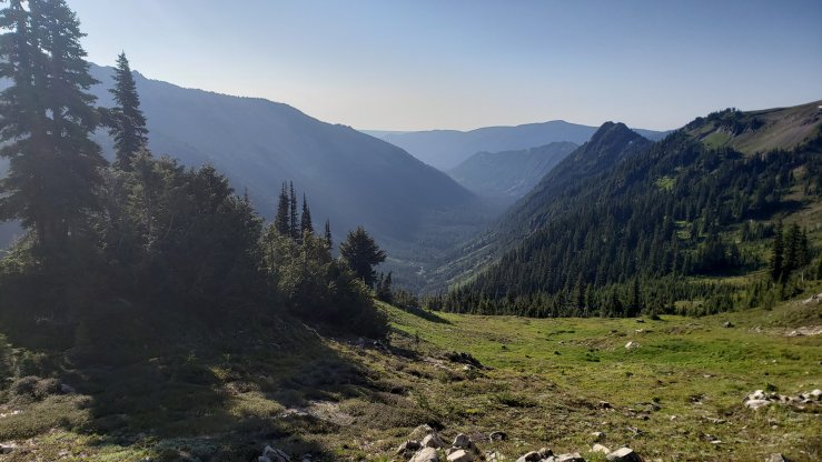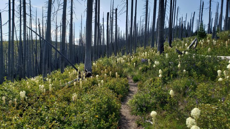 Day 94 was sunny and decently warm, which made for a nice day of hiking. The trail provided many views of the rolling green mountains in the area as it climbed and descended all day. Despite having nearly no flat sections, the day was not bad as the trail was well-maintained and mostly dirt. A burn area near the end of the day was filled with wildflowers, a neat contrast. We camped near the Mike Urich cabin, a 23.8 mile day. Another fire was had, with Milk Jug, Blueberry, and Colleen the Machine joining us.