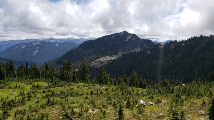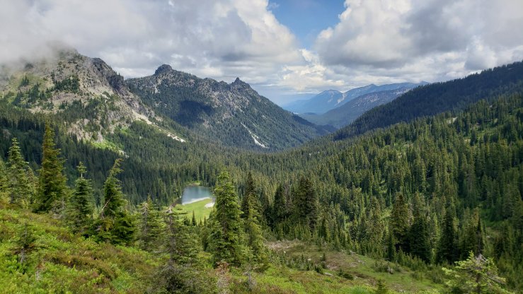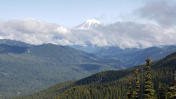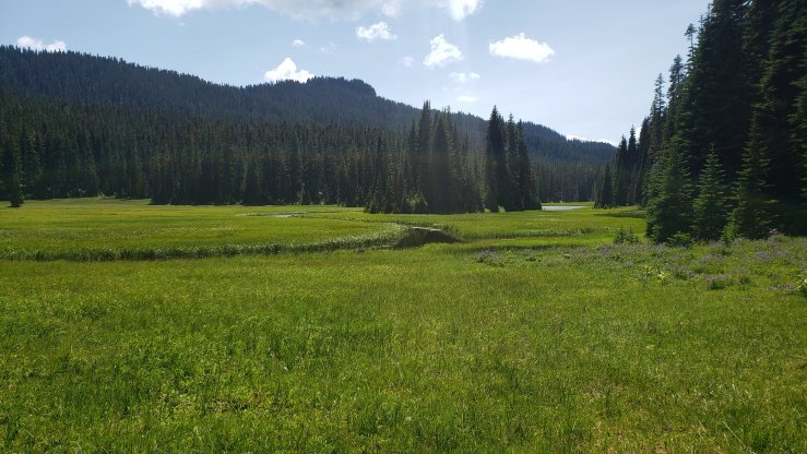 We had heard that the last ten or so miles leading up to White Pass were very buggy, so we prepared ourselves for another evening cooped up in our tents. It continued to rain on the morning of day 96, although it eventually cleared up and the sun poked its way out. Once it was clear, the views were lovely, the trail meandering through forest, meadows, and open ridges. The overall grade of elevation change was a bit less than usual for Washington, so I felt good as I hustled through the mosquito territory — an area filled with little lakes and ponds — near the end of my 24.9 mile day. I unintentionally startled an elk at one point, a large female that crashed through the thick forest as it ran away. She glanced back, looking majestic and annoyed. Camp at Buesch Lake was indeed overran with mosquitoes, so we all sheltered in our tents, despite the sunny and comfortable evening.