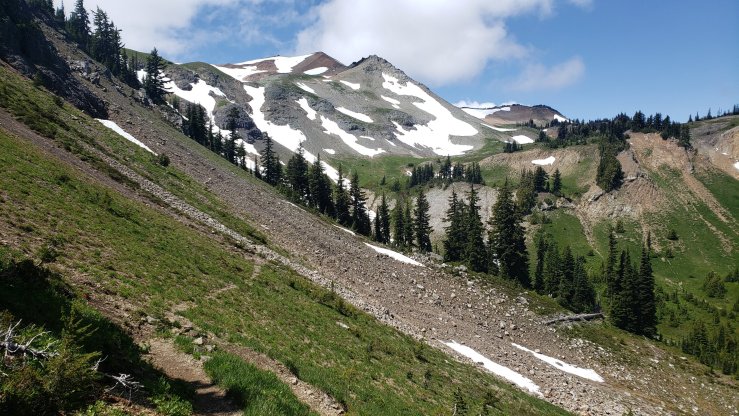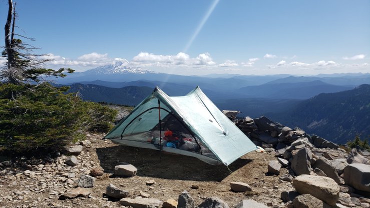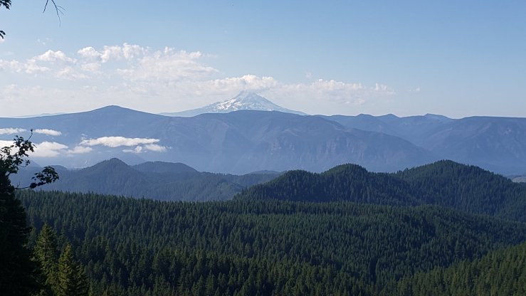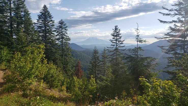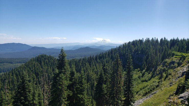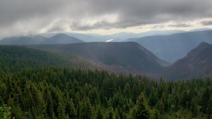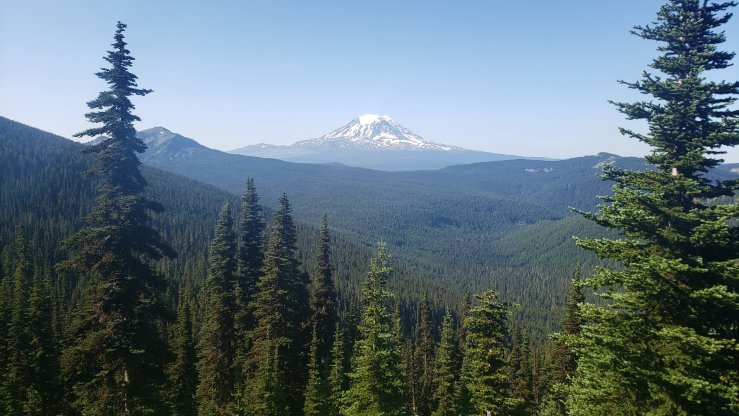 Day 102 was Indian Heaven Wilderness, AKA the worst mosquito day in Washington. I knew this ahead of time, and so I spent the entire day in my wind pants and wind jacket, also frequently donning a bugnet over my head. It was hot but better than being eaten alive. Most of the day was not terrible, though around some lakes they got very aggressive. Blue Lake provided a nice breeze however, and I was able to enjoy lunch there before finishing up the day. The day was mostly spent in buggy forest, though we did get our first good look at Mt. Hood. We camped near a gravel road and trailhead, at the end of the Indian Heaven Wilderness. The bugs were thankfully not too bad at our campsite at mile 454.7.