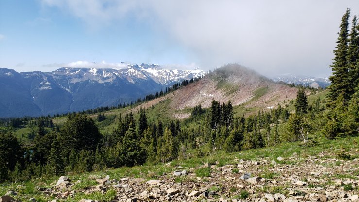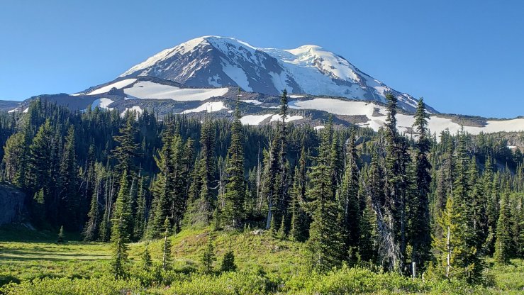 On day 101, we had the opportunity to go into Trout Lake, where we could get burgers and beer. It was 20.5 miles to the road where one can hitch to the minuscule town, so I got going fairly early. The trail passed mostly through fairly buggy forest, occasionally opening up to grant awesome views of Mt. Adams and Mt. Rainier. After a few miles, the trail opened up in a sub-alpine area. The sun was shining, there was a decent breeze, and views all around, but the day was marred a bit by mosquitoes yet again. I made the miles quickly and got an easy hitch into town around 1:30. I vented my frustration with the mosquitoes to the girls over lunch, and decided to hitch to Bingen, WA to visit Margie’s Pot Shop to resupply on safety supplies. I caught a ride in about 5 minutes, as two nice women who were avid hikers themselves picked me up. A half-hour later I was at my destination, and after getting what I needed, I was on the side of the road again, thumb out. I got back to the trailhead in three hitches, waiting less than a half-hour combined. We had planned to do 5 more miles rather than stay in town. I made the miles quickly as we camped near Trout Lake Creek at mile 428.8.