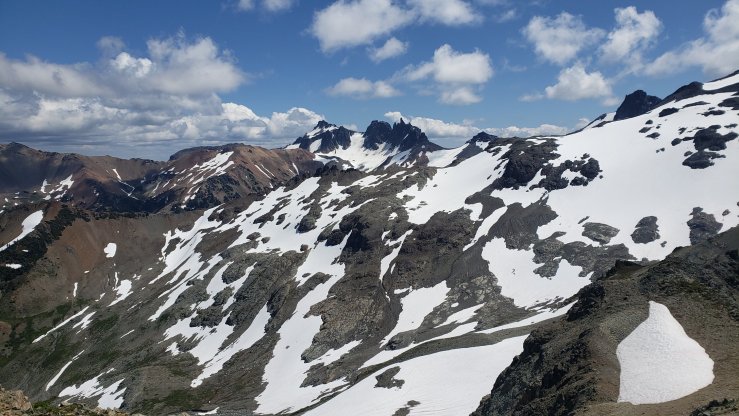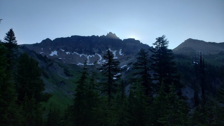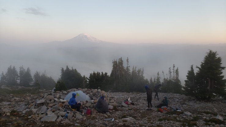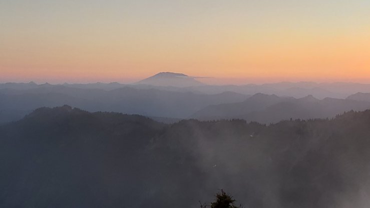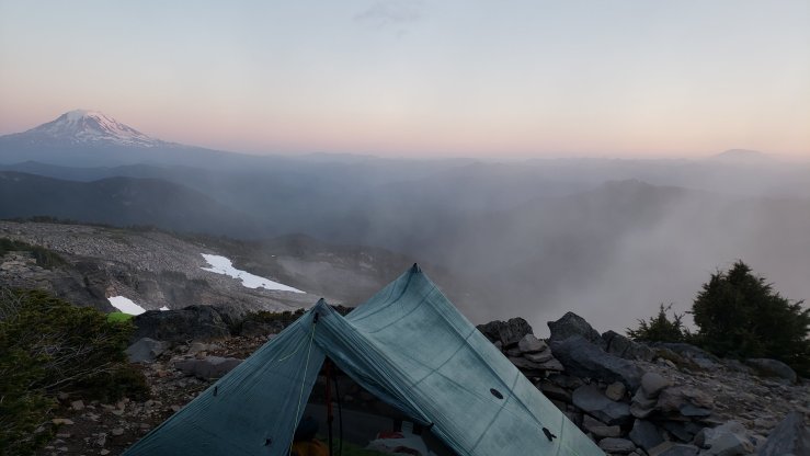 I was on trail just after 6 AM on day 99, eager to hike in nice weather through beautiful terrain. The forecast said the early morning clouds would clear by 10, which would hopefully lead to spectacular views from the Knife’s Edge section of trail near the end of the day. The trail ascended sharply from the pass, through dense but pretty forest. Eventually, the trail opened up to a large rocky face, and made its way up to a pass, and the first glimpse of the Goat Rocks mountains. The scene south of us was lovely, clouds tearing across the peaks as the morning sun drove them away. To the west, however, thick low clouds still hung, rolling over the ridge towards us only to dissolve in the warm sunlight. Inge and I decided to wait for the clouds to clear a bit before heading over the western pass. After about an hour, the clouds had mostly cleared, and we headed on. Rainier was visible though somewhat obscured with clouds, but still lovely to see. A brief burn area led to great views of the range ahead. A short while later, the trail reached alpine again, and climbed very steeply up towards Old Snowy Mountain and the Knife’s Edge. After rounding a tight bend on a steep rocky face, we emerged onto an incredible ridge walk, the trail cutting up the side of a steep rocky slope. As we progressed higher, we passed snowfields, the exposed ridge on which we walked mercifully clear. The views of the surrounding valleys and ranges were stunning as we climbed even higher, reaching the junction where the official PCT follows a stock-friendly route, whereas the old PCT traverses what’s known as the Knife’s Edge. A steep and brutal climb up unstable lava rock and glass-like sheets of hard slate awaited us as we took the alternate, which most hikers opt to do, as the view from the top was great. Mt. Adams, Mt. Rainier, and Mt. St. Helens were all in view, along with the surrounding mountains, layers upon layers as far as the eye can see. We made our way down to our campsite after crossing a brief snowfield. We camped at mile 376.3, just south of the Knife’s Edge — an 18.5 mile day, but a tough day regardless, due to unusually steep trail (for the PCT). The views were incredible from this alpine campsite, with Adams and St. Helens visible from my tent. Eventually, Slippy, Cloud, Jan, John Mayo, 6:30, Sprinkles, and Sara joined Sunny, Inge, and me, and we enjoyed each other’s company in the setting sun. A fog rolled in right before sunset, but I was still able to get some great views and pictures, one in particular of St. Helens at sunset.