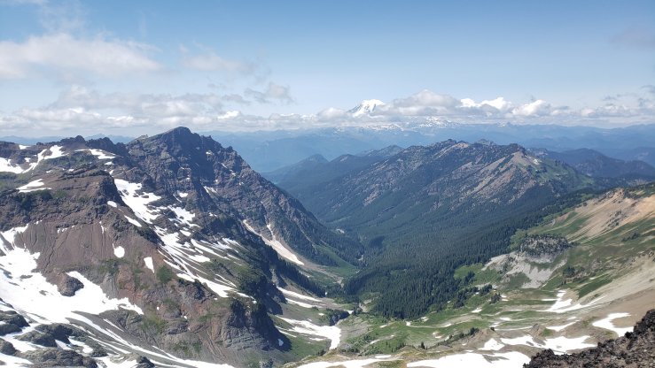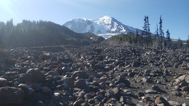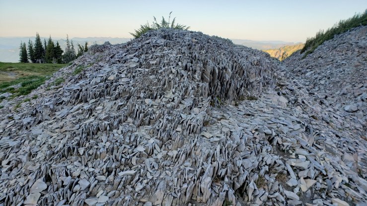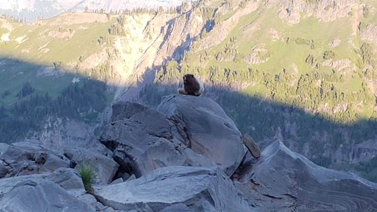 Day 100 was a bluebird day, not a cloud in the sky as I rose early. I snapped a few sunrise shots before leaving camp, a bit sad that this incredible area would be ending already today. Some charismatic marmots posed for me as I passed, and some of the rock piles were unlike anything I’d seen before. The Cispus valley was pretty, still in the morning shade as the sun climbed the peaks. Once over Cispus Pass, the Yakima Reservation valley opened up before me. A short while later, another excellent view of Adams was had before the trail descended into the forest for the rest of the day. We camped near a field of lava rocks, where a spring gushed forth, filtered by the igneous rock. It was a 26.8 mile day, ending at mile 403.1.
