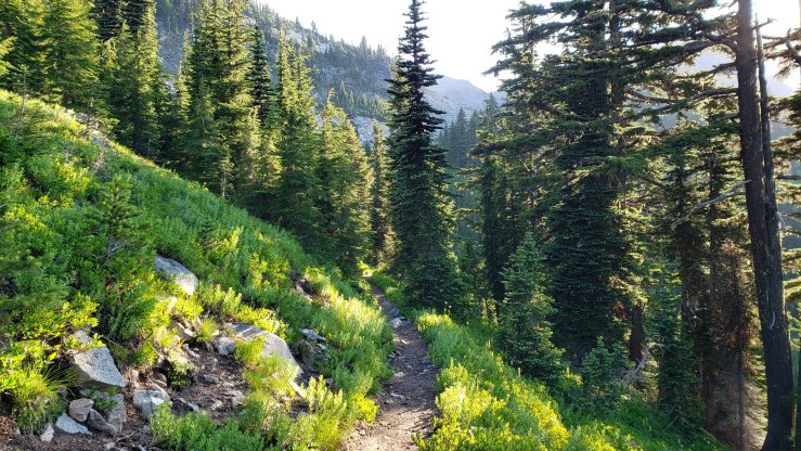 We awoke to rain on day 95. It rained basically all day, sometimes barely a drizzle and occasionally a near downpour. This meant few views, despite passing over open trail that almost certainly provides stellar views on a clear day. I kept my head down and headphones in, letting myself fall into an automatic state as I listened to audiobooks and podcasts to pass the time. We made it a shorter day because of the crummy weather, hiking 21.3 miles to Sheep Lake at mile 326.9. The same crew joined us at camp again, as well as Solo, although there wasn’t too much socializing on the wet and chilly night.
